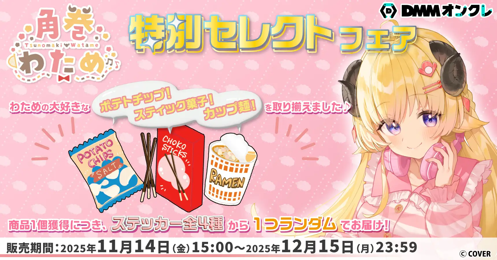 合同会社DMM.com(本社:東京都港区、PFカンパニーCEO:村中悠介、以下DMM)が提供するオンラインクレーンゲームサービス「DMMオンクレ」は、ホロライブ所属VTuber「角巻わため」がセレクトした景品を獲得できる「特別セレクトフェア」を、2025年11月14日(金)~12月15日(月)まで開催します。