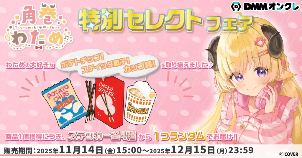 合同会社DMM.com(本社:東京都港区、PFカンパニーCEO:村中悠介、以下DMM)が提供するオンラインクレーンゲームサービス「DMMオンクレ」は、ホロライブ所属VTuber「角巻わため」がセレクトした景品を獲得できる「特別セレクトフェア」を、2025年11月14日... -